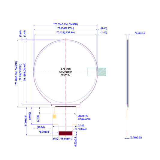 2.76" 円型 TFT LCDモジュール (480 x 480) [ST0276A1W-RSMLW-F]