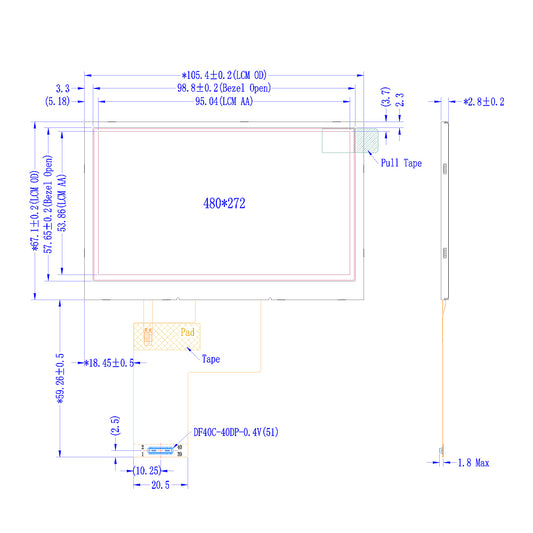 4.3" TFT LCDモジュール (480 x 272) 静電容量タッチパネル付き [ST0430E2WCY-RSLW-F]