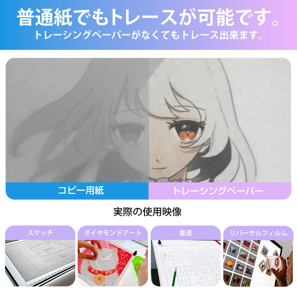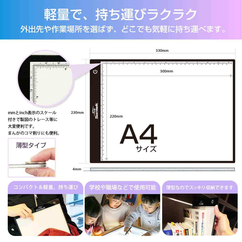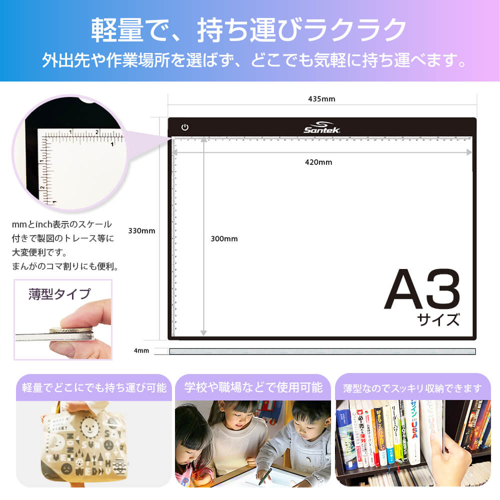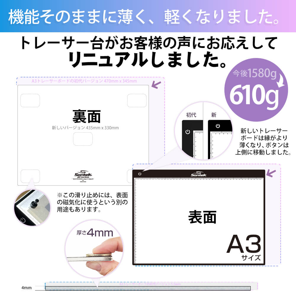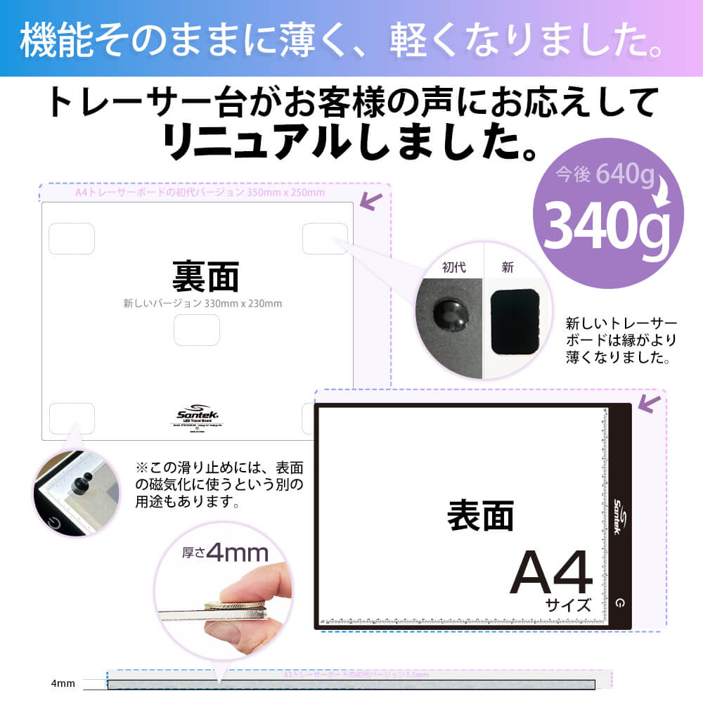 トレース台本体は厚さ4mm重さは約340g~で薄型・軽量ですので、どこへでも気軽に持ち運びができます。