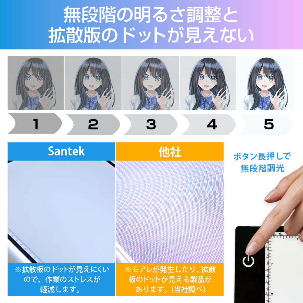 従来品同様に目に優しい色度の白色LEDを用いています。発光面のスケー(cm/inch)、紙を固定するマグネットも付いています。従来製品より軽量小型化を狙い、A3, A4の用紙にジャストフィットさせるなどの改良を加えた上にお求めやすい価格にしました。