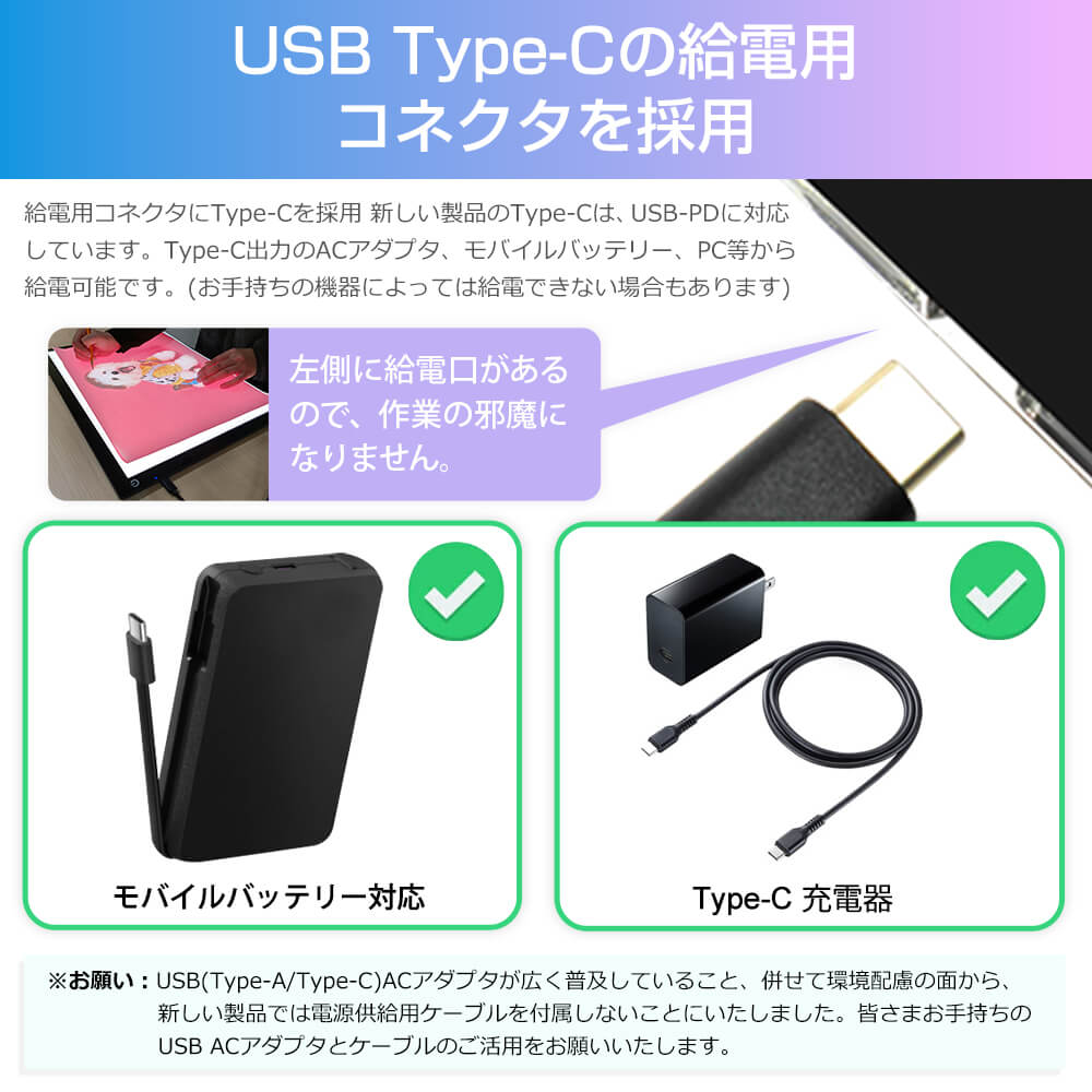 更に、この製品は、Type-C to Type-C ケーブルを使って、ACアダプタ以外にモバイルバッテリーやPCから電源を取ることもできます。