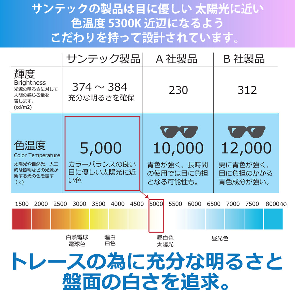 LED光源に含まれるブルーライト(青色光)は目の奥に届きやすく、光の散乱やちらつきが原因で目の疲れや不快感を引き起こすことがあります。サンテックのトレーサーボードは、輝度を維持しつつも目に優しい色温度5,000KのLEDを採用することで、ブルーライトの影響を軽減し、長時間使用しても目や身体への負担を最小限に抑えます。