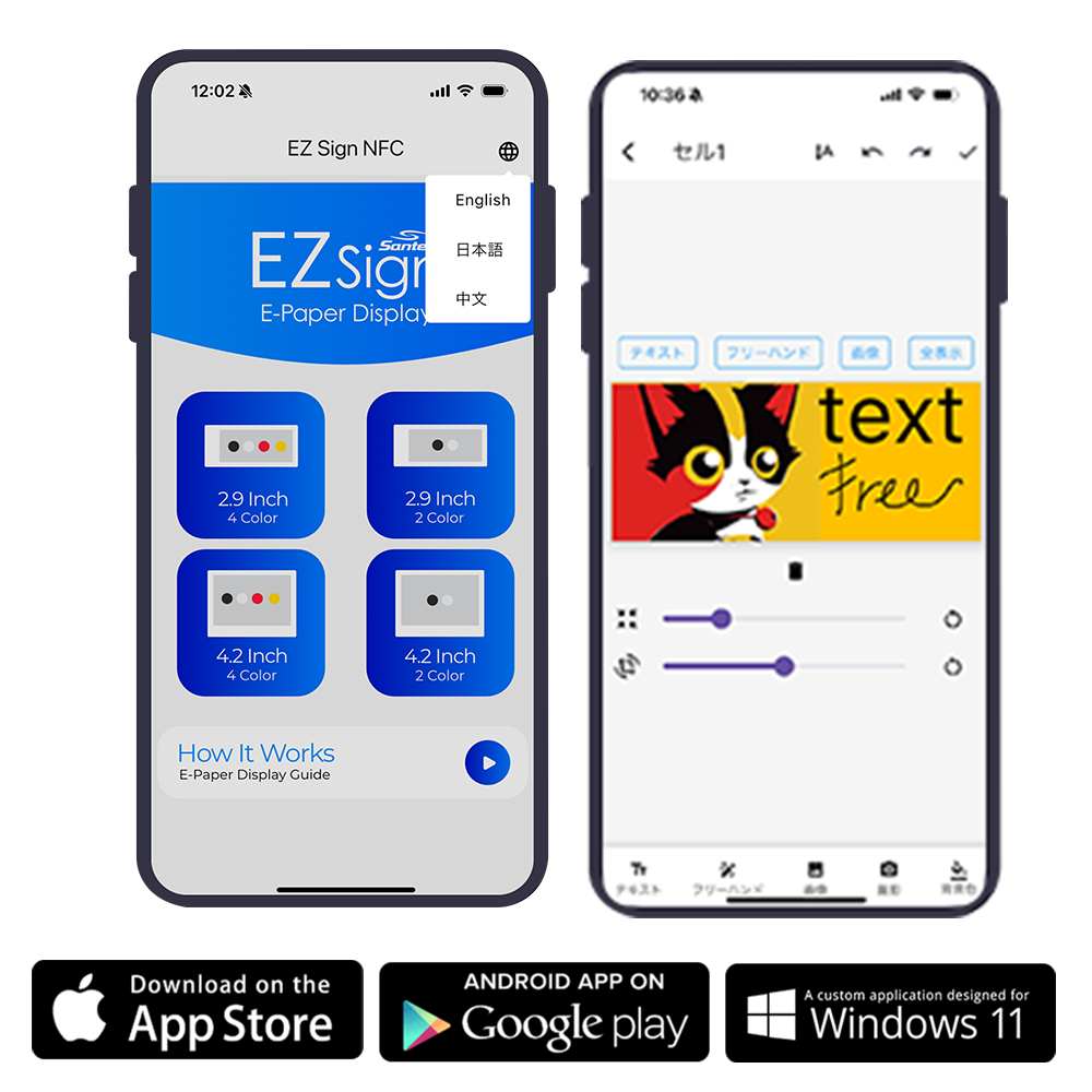 A. 専用アプリ内で文字入力・簡単なレイアウト編集ができるほか、 画像データを取り込んで表示することも可能です。 推奨の画像サイズ・形式についてはマニュアル/アプリ内ヘルプをご確認ください。