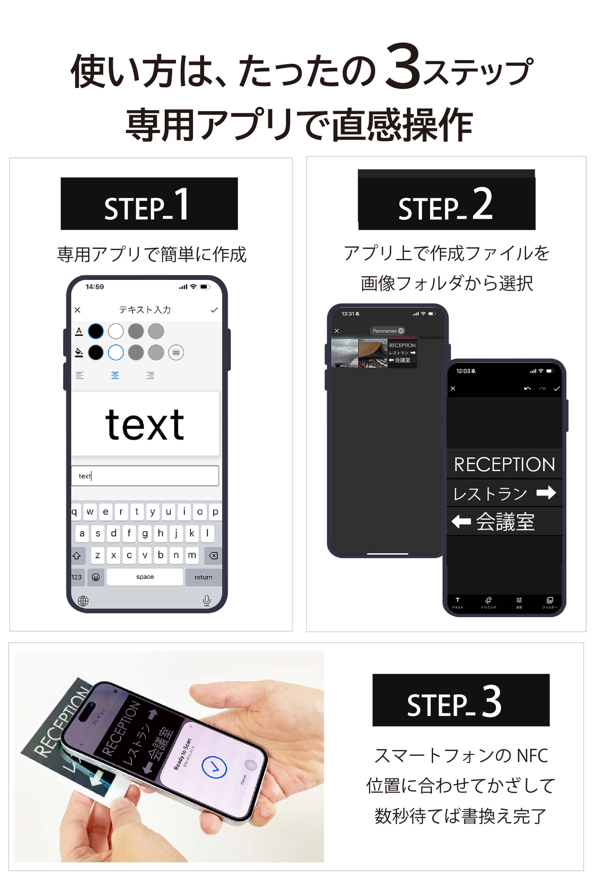 専用アプリを起動し、スマートフォンを本体にかざすだけで表示を更新できます。 書き換えに必要な電力はNFCから供給されるため、本体に電池は不要です。